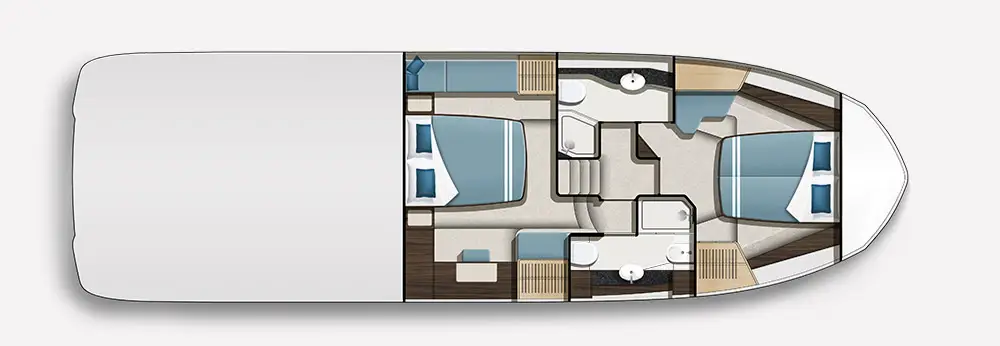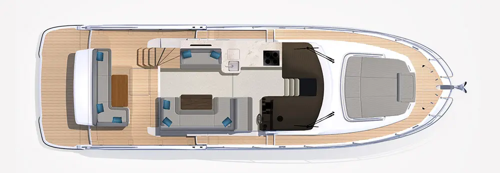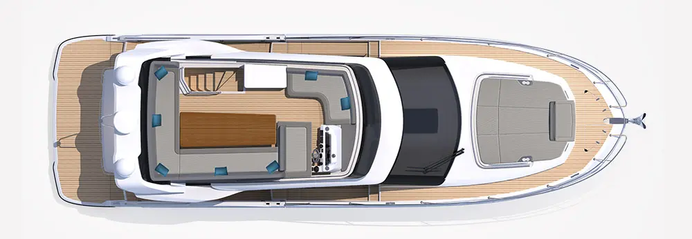 The Galeon 440 Fly yacht features a dynamic exterior designed by Tony Castro Design Studio, bringing a distinctive fourth-generation Galeon style. Large windows across both decks allow light into the interiors, while the sporty profile ensures a strong presence on the water. This model combines modern comfort with practical layouts, making it a strong choice for those exploring yachts for sale in Dubai and GCC markets.