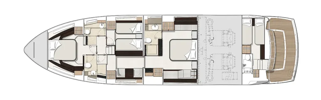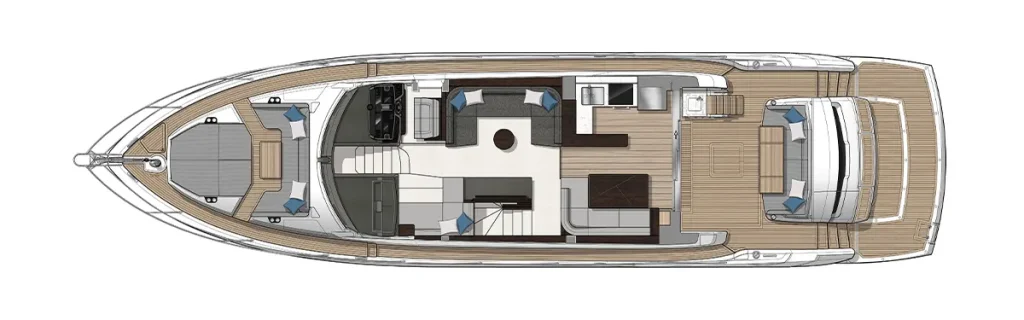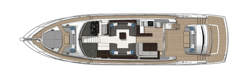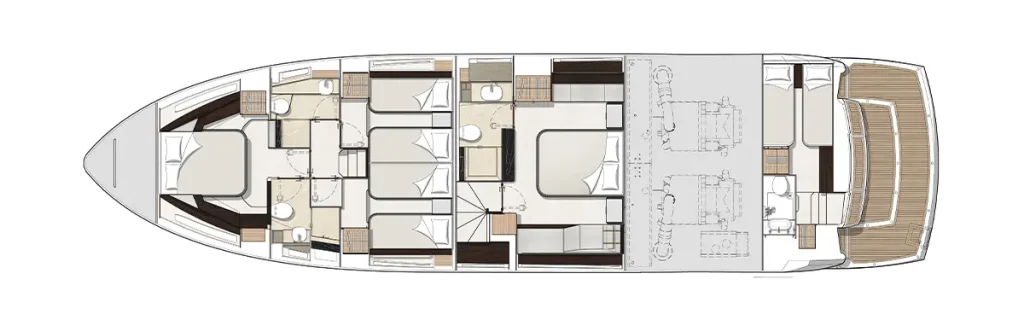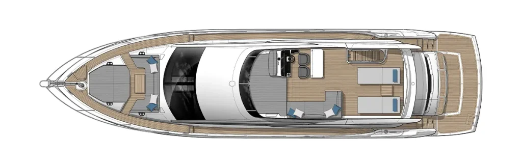 Innovative Beach Club – Featuring a dedicated water-level locker for two SeaBobs, creating a perfect space for waterside relaxation and activities. Expansive Glazing in the Main Saloon – Extending below the TV console to offer uninterrupted views of the sea from every angle. Full-Width Sliding Doors & Aft Galley – Seamlessly connecting indoor and outdoor spaces for a highly social and fluid experience. Sumptuous Master Cabin with Private Staircase – Offering exclusive access amidships for enhanced privacy and luxury. Portuguese-Bridge Bow Seating & Sunbathing Areas – Providing generous outdoor lounging spaces for ultimate comfort and enjoyment. A stunning blend of luxury, social connectivity, and thoughtful design, the Manhattan 68 promises an exceptional yachting experience.