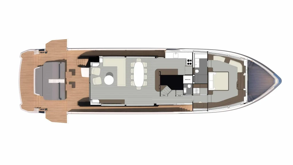 This exceptional yacht offers five beautifully appointed en-suite staterooms along with space for three crew, ensuring luxurious accommodations for all on board. The main deck master stateroom is a standout feature, complete with a private forepeak terrace, offering an exclusive retreat with stunning views. Seamless accessibility is achieved through direct access from the flybridge down to the foredeck lounge, leading ultimately to the master cabin. Owners can choose between two distinct aft deck layouts—Riviera or Veranda—designed to suit different yachting lifestyles. For adventure lovers, a vast garage provides ample storage for a tender, jet ski, SeaBobs, and other water sports equipment, ensuring endless opportunities for fun on the water. The foredeck lounge, designed with Bedouin-style awning, features large sun pads and a retractable table, creating a relaxing and scenic space. Meanwhile, the extended flybridge is built for entertainment, boasting a full-sized dining table, a multi-functional wet bar, and a sun pad-hot tub combination. A variable hard top enhances versatility, offering three adjustable settings—full shade, adjustable louvres, and full sun—to cater to different weather conditions and personal preferences.